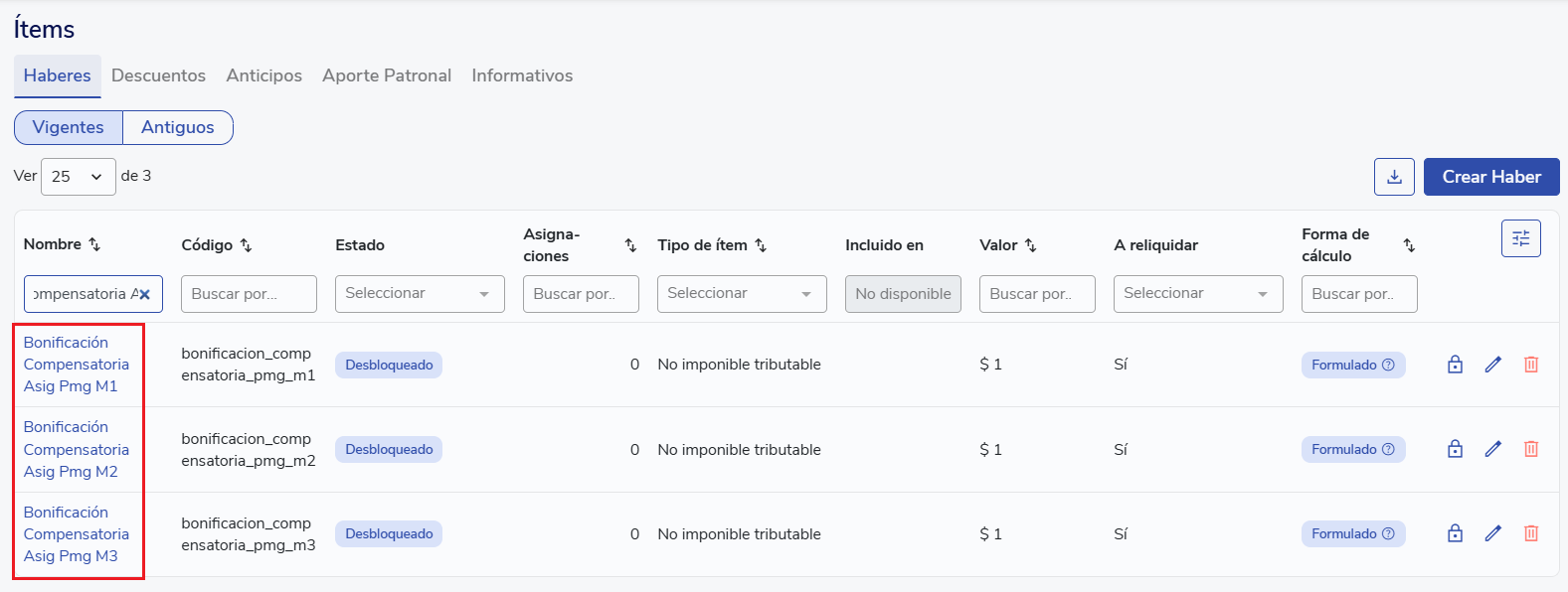 Ítems de tipo haber para reliquidaciones de bono compensatorio: