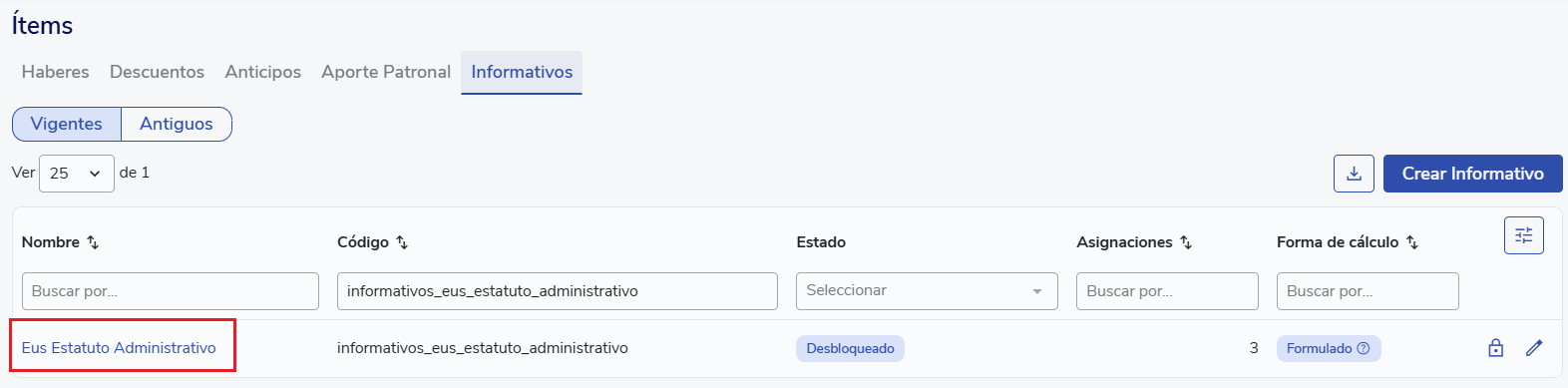 Configuración de items informativos: