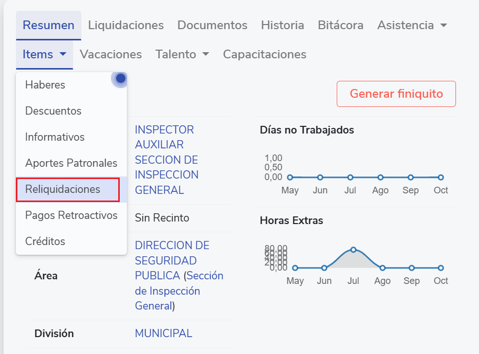 Ve al perfil del funcionario, entra en la sección “Ítems” y selecciona la opción “Reliquidación”.