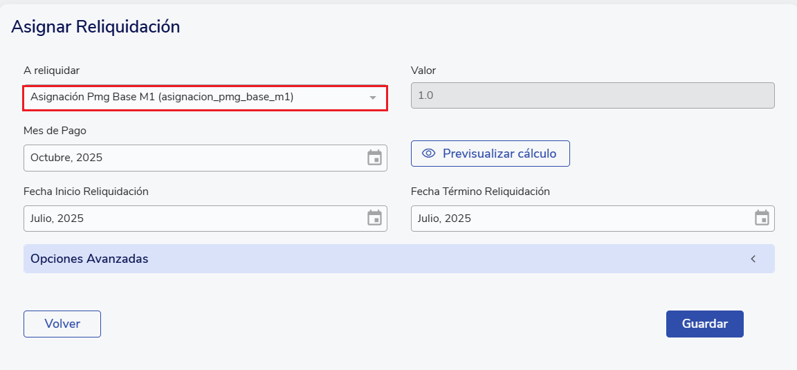 Al asignar, asegúrate de registrar el mes de pago según el periodo que quieres reliquidar. En este caso, el mes 1 (M1) corresponde a julio, que es el primer mes de devengo.