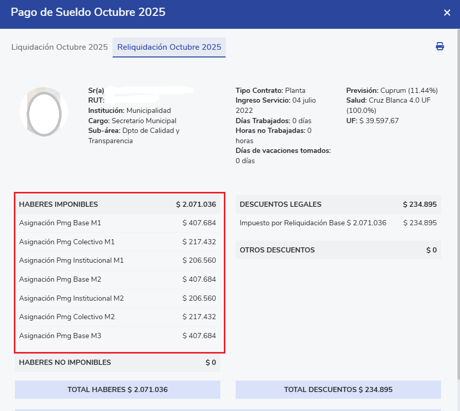 Valida que los importes de los componentes correspondan al grado de cada persona y a los valores entregados por la Contraloría. Realiza esta validación desde el primer mes que se pagará en la próxima reliquidación. Ejemplo: La validación para el pago de octubre debe realizarse desde el mes de julio (M1).