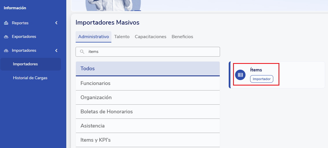 - Ve a la sección de importadores y selecciona el importador “Ítems”.