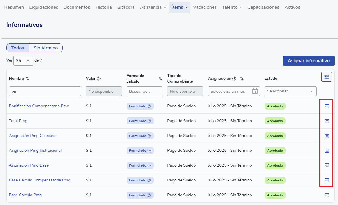 b) Previsualiza los ítems informativos y valida que los importes sean correctos. Por ejemplo, si vas a reliquidar en octubre, revisa los informativos de julio, ya que deben estar ajustados antes de cerrar el mes.