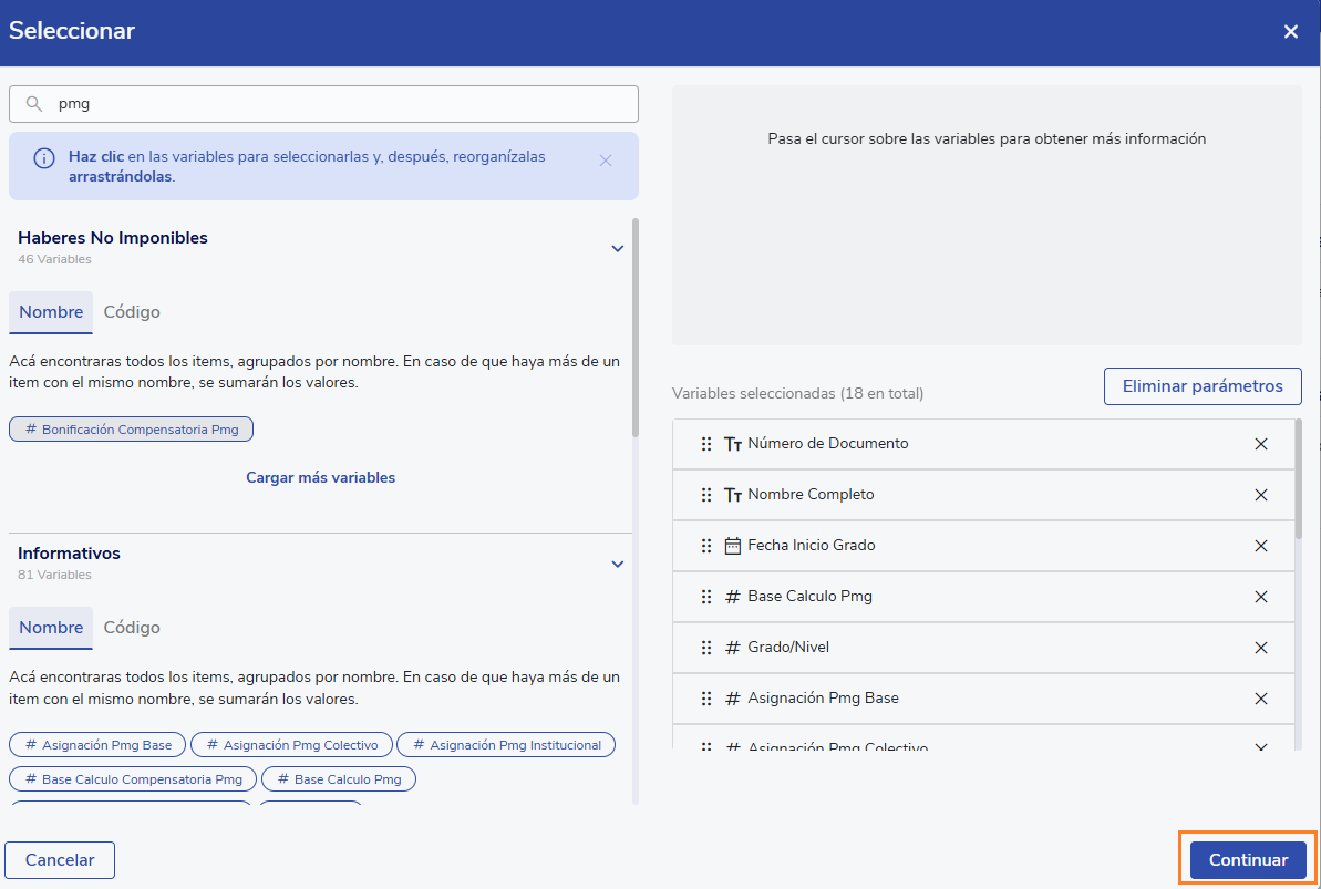 Selecciona o arrastra los campos necesarios para validar los pagos y los datos del funcionario.