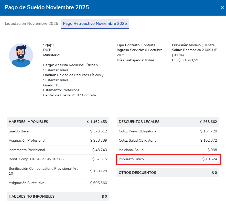 El impuesto único retroactivo a cobrar en noviembre es: $10.624